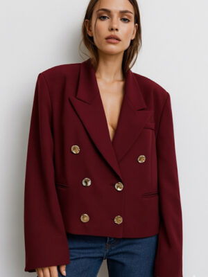 A beautiful ruffled blouse with buttons down the middle, pearls with a gold rim around the pearls on the buttons.