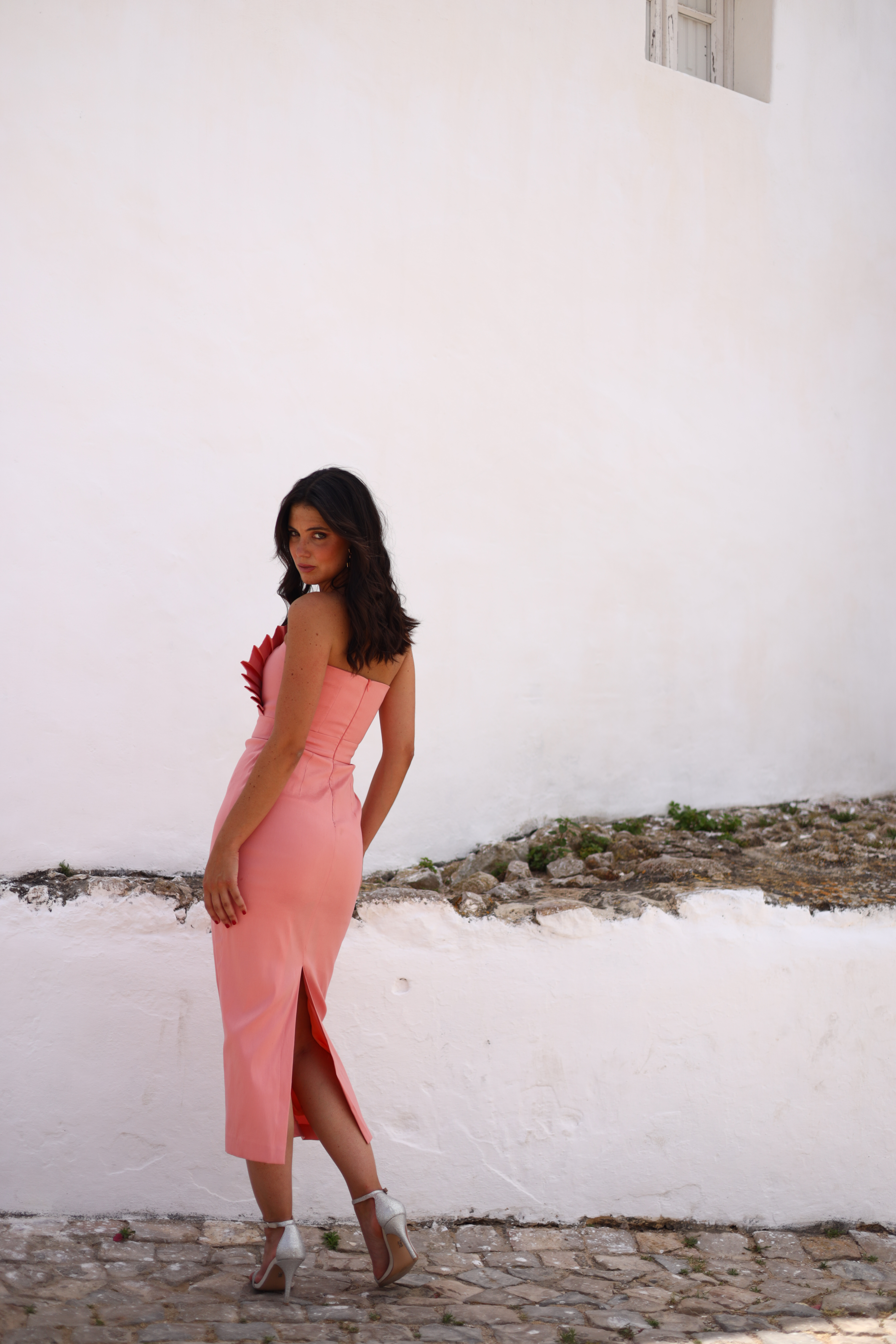 • The dress has a single strapless side, giving it a sleek, modern asymmetry.