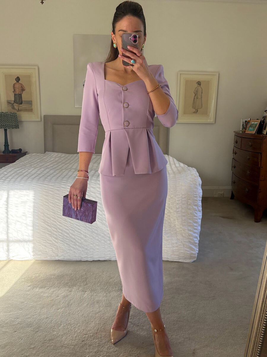 A stunning lilac dress perfect for a spring or summer event. 3/4 length sleeves. Fully lined. Fully closed on back with zip. Has peplum style on front. Has 3 buttons with gold rims. Has a small slit on the back of the bottom of the dress.
