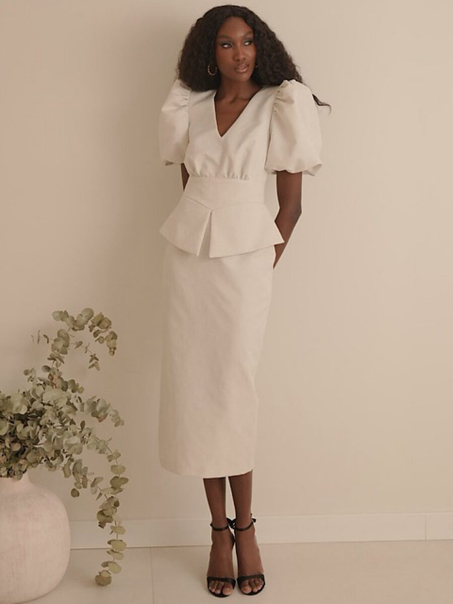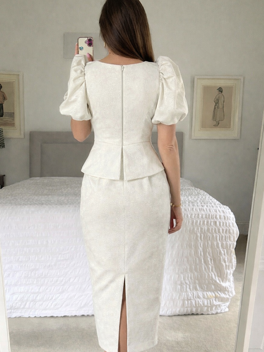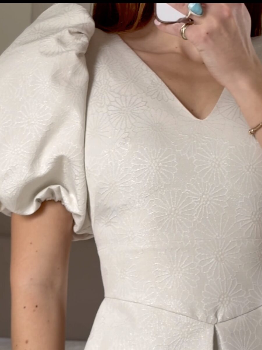 A stunning quality dress perfect for any occasion or Mother of the bride or Communion etc. Fully lined, Has a peplum style around the front of waist. Fully closed on back with zip.Has padded & puff shoulders with sleeves sitting a few inches above the elbows. V neck line.