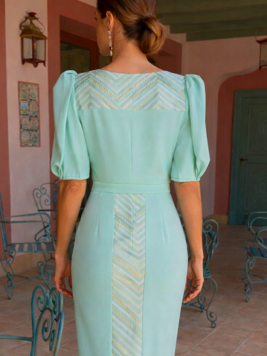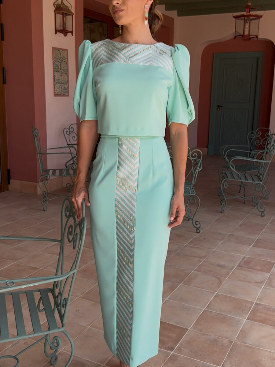 COLOUR – Mint Green with gold and white design throughout the front of skirt and top of the top.