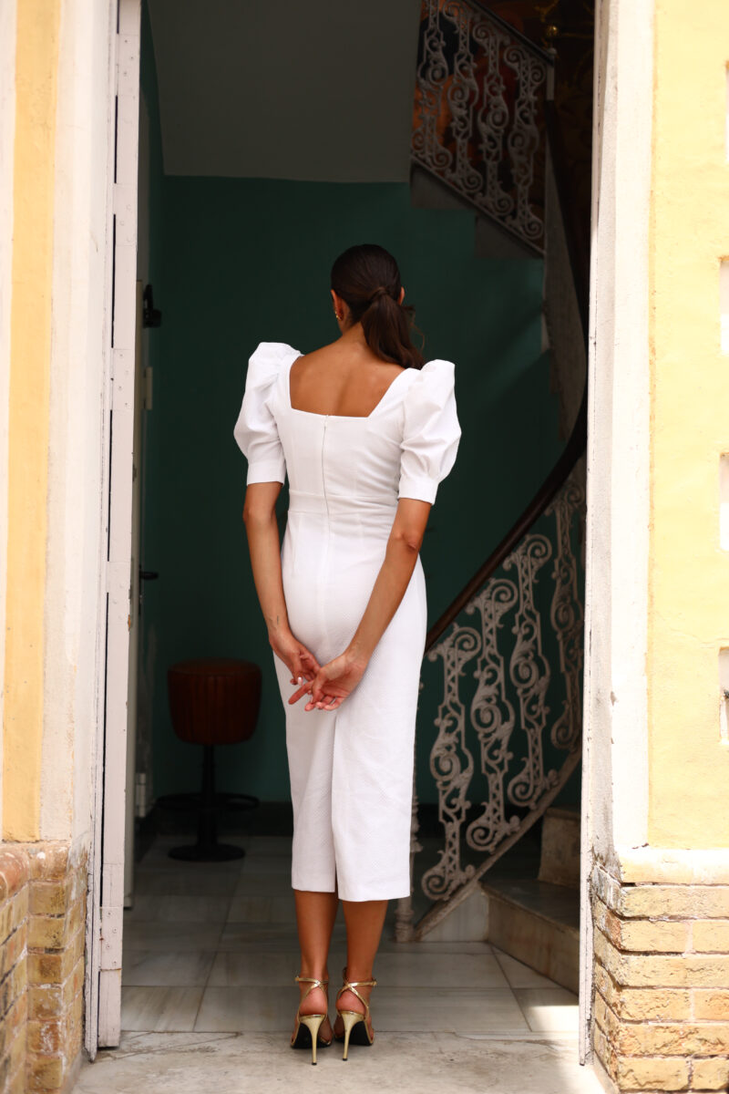 • The dress has puff sleeves, a square neckline, and large front buttons, which gives it a slightly vintage / retro-inspired look (almost 1950s–60s elegance).