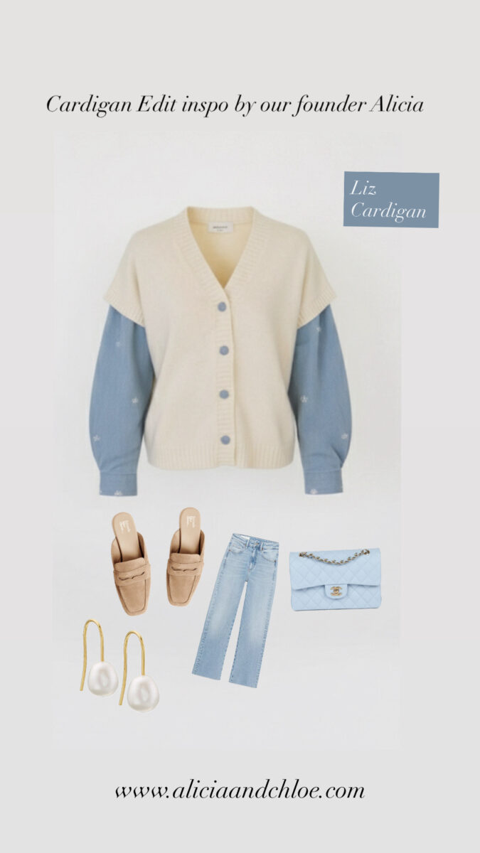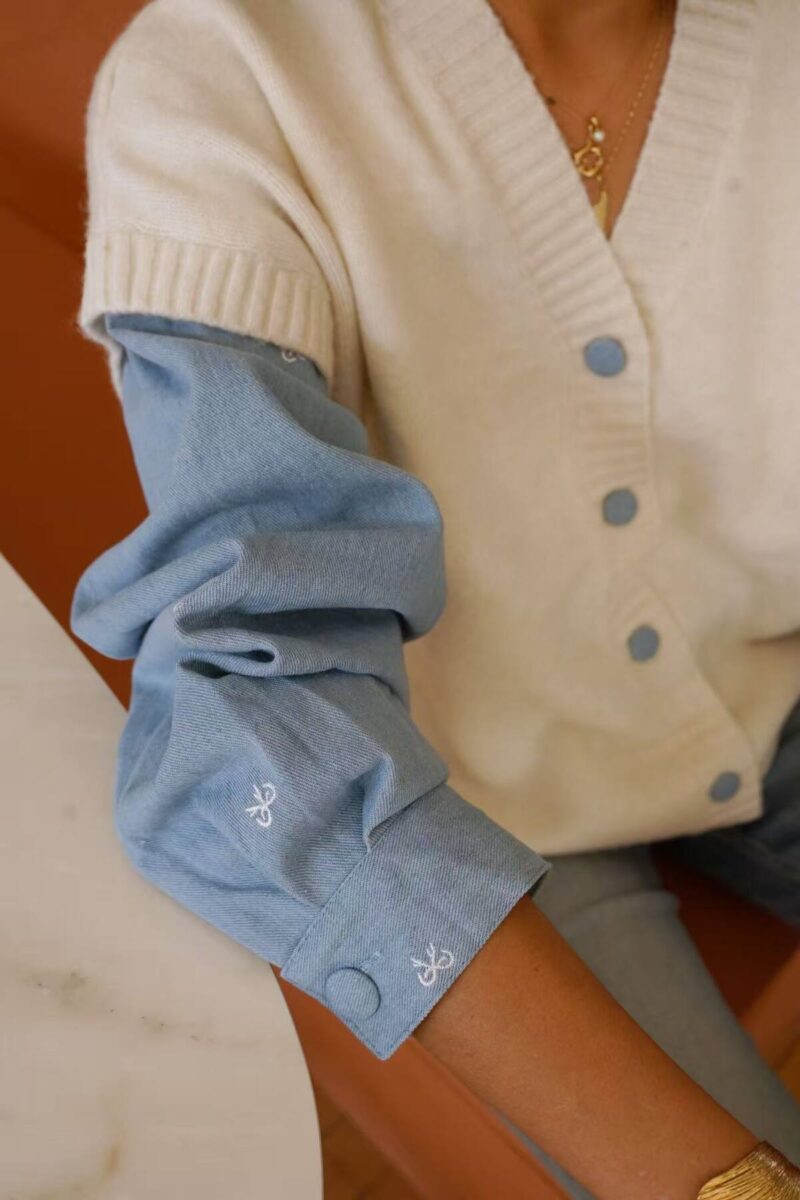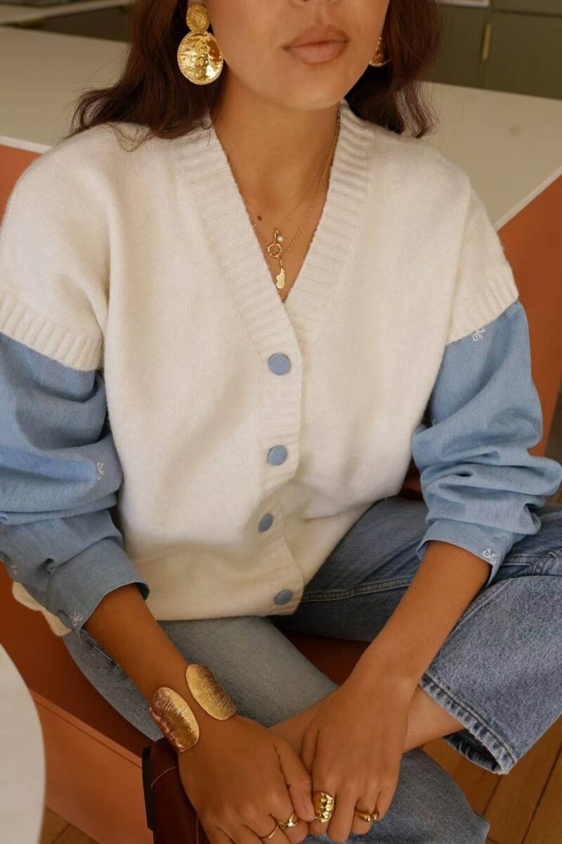 A beautiful off white oversized cardigan with baby blue buttons and blue sleeves with a little white design on the sleeves. It is all attached as one.