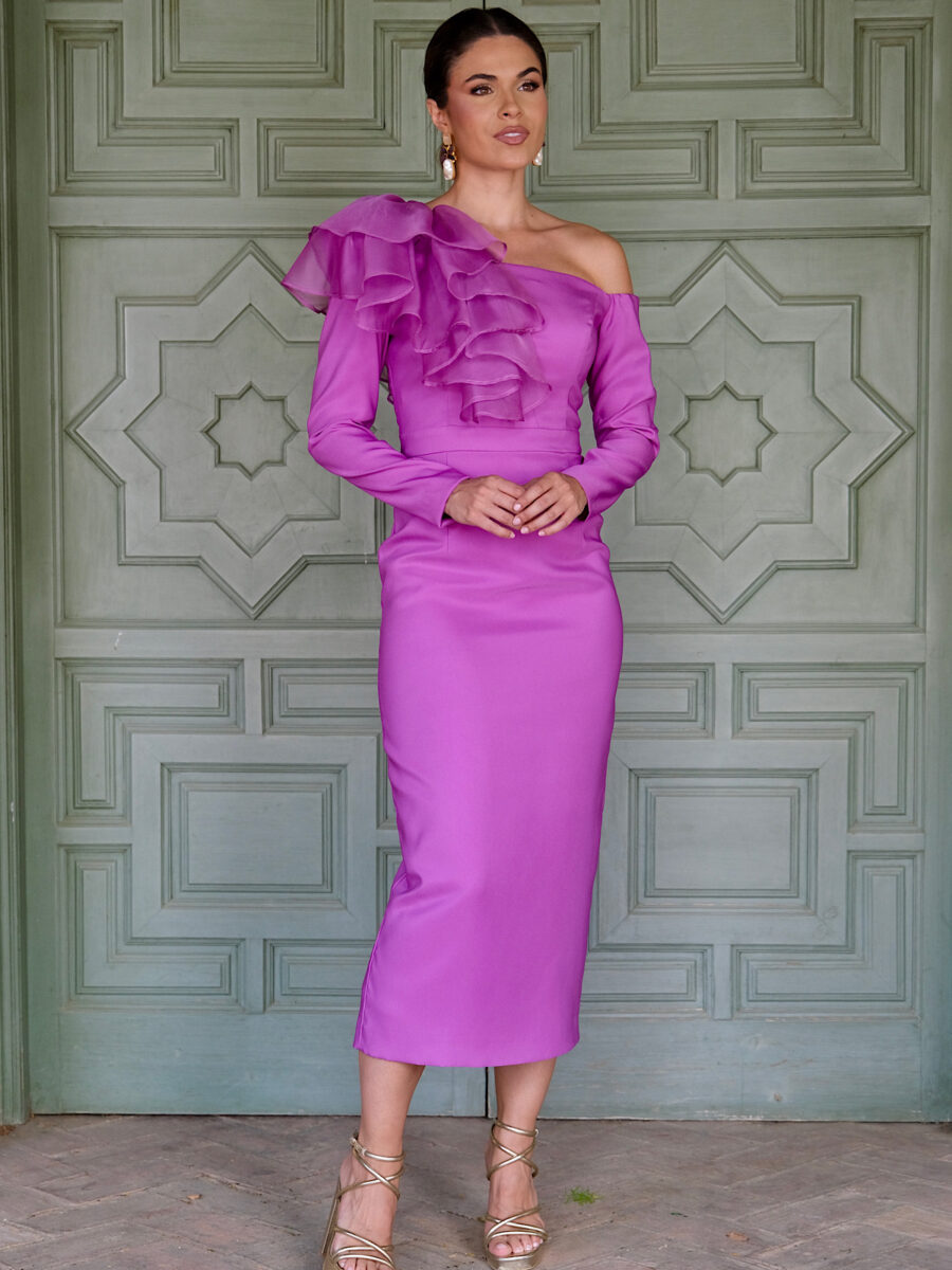 A stunning purple dress. Fully lined. One shoulder dress and some detail on the front of the dress on the chest to one side. Long sleeves. Perfect for a wedding guest or any formal event .