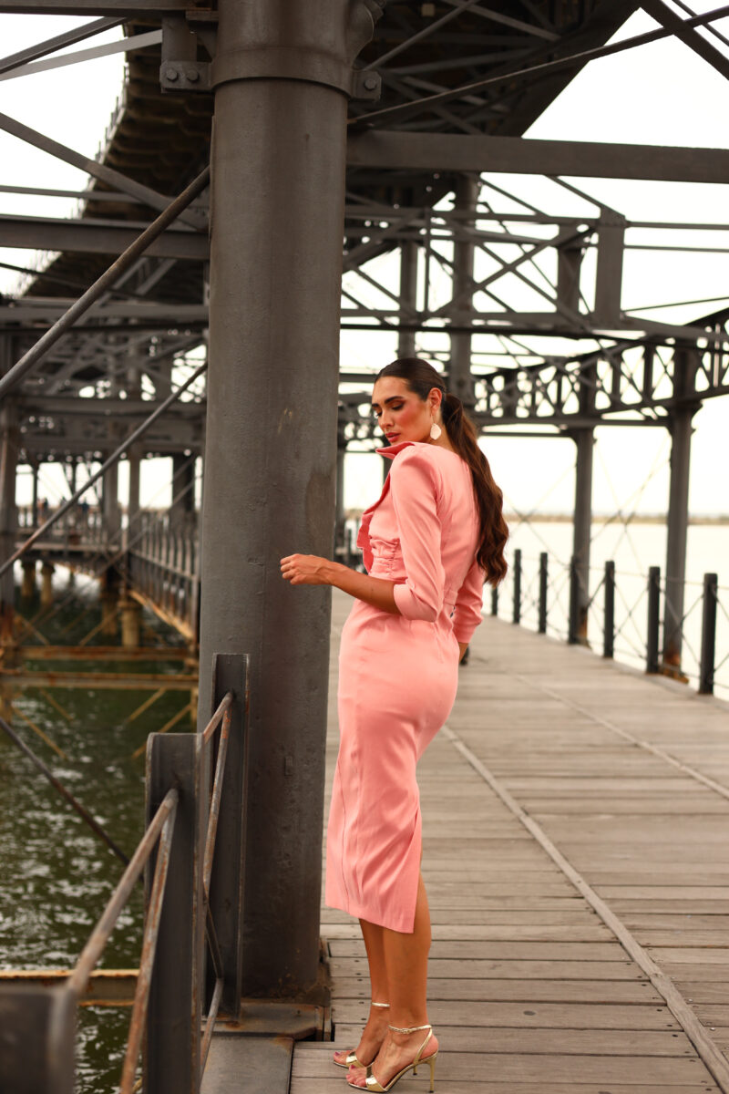 A beautiful salmon pink dress, the material is called wild shantung. Beautiful material. Fully closed on the back with slit on the bottom of the back of the dress. 3/4 length sleeves. Has detail on the front of the dress on chest. V neck line and padded shoulder detail.