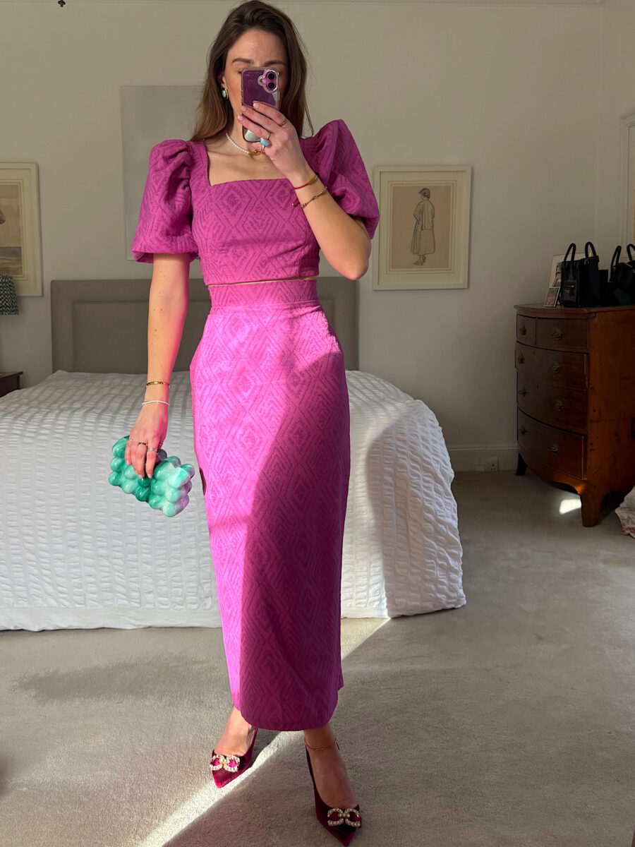 - A matching high-waisted, magenta/fuchsia midi skirt in the same geometric jacquard-style fabric.