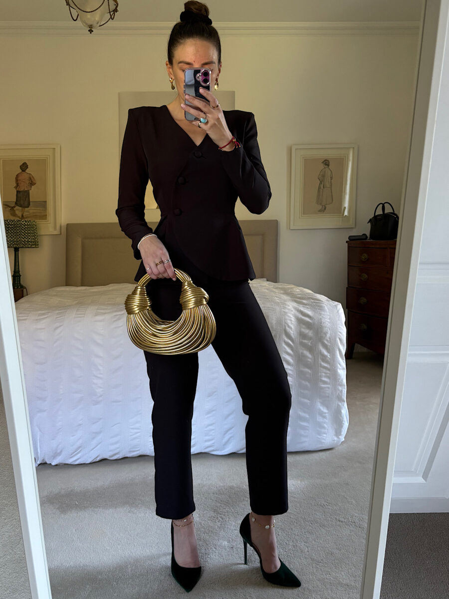 A stunning two piece suit for a formal event or even for office wear. Very chic and classy. Blazer is lined and trousers have a zip on them.