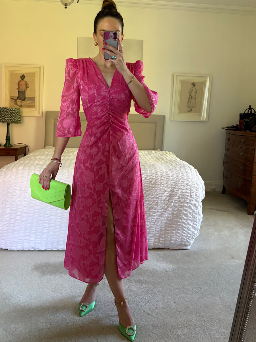 The dress is a vibrant, statement-making piece in a bold strawberry pink tone with a subtle floral jacquard texture woven into the fabric. It has a flattering, feminine silhouette with a fitted bodice and a softly flared midi-length skirt.