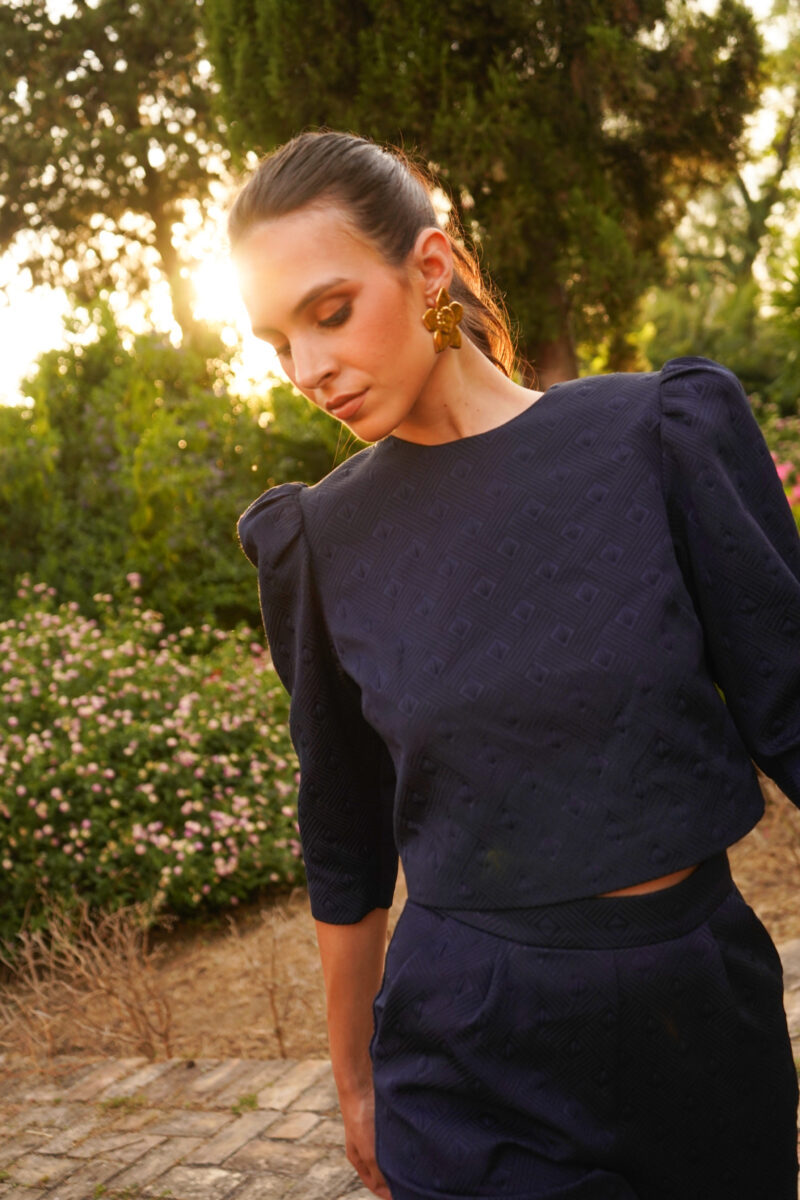A stunning two piece set. Navy in colour and fully lined. Trousers have zip on back. Top has buttons on the back that are black. And has 3/4 length sleeves.