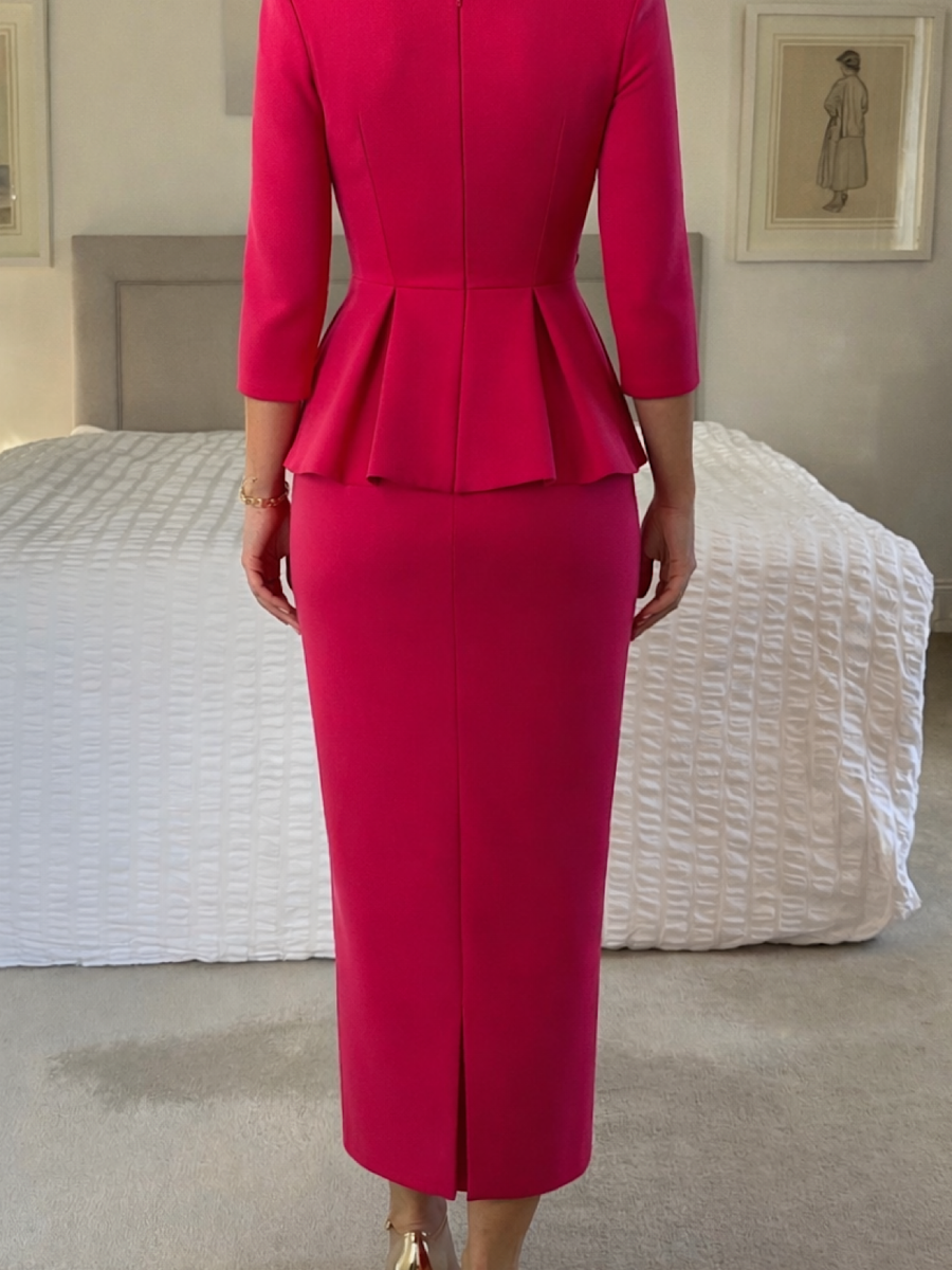 A stunning dress perfect for a spring or summer event. 3/4 length sleeves. Fully lined. Fully closed on back with zip. Has peplum style on front. Has 3 buttons with gold rims. Has a small slit on the back of the bottom of the dress.