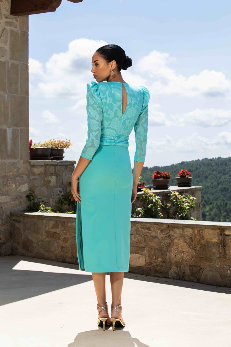 The dress is an elegant, fitted midi-length piece in a vibrant turquoise/aqua tone. It has a structured yet feminine silhouette: